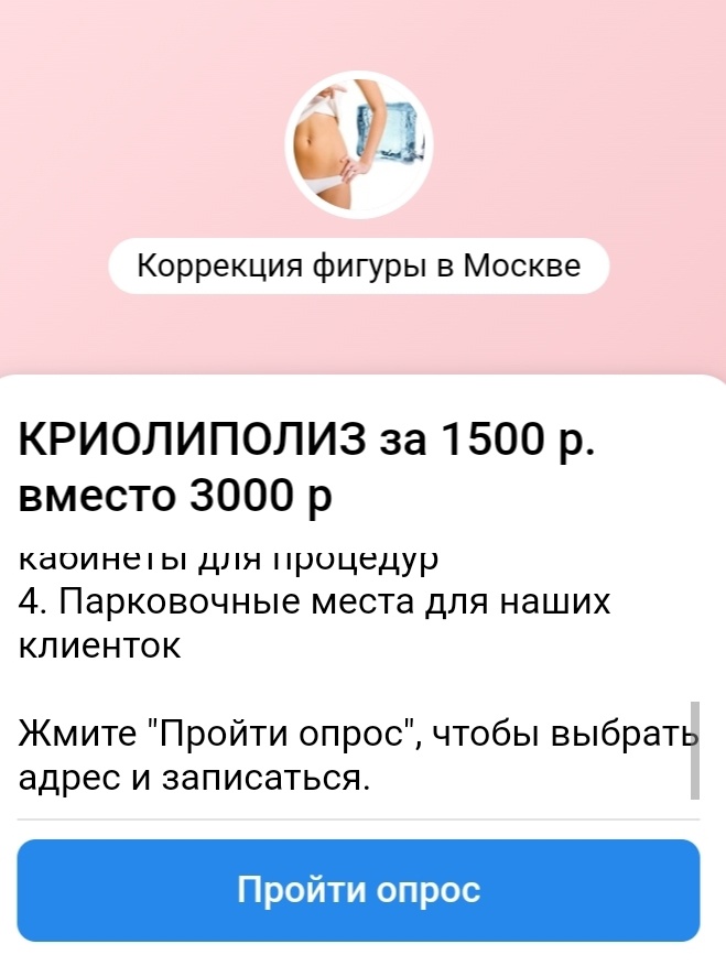• после активации, клиентка проходила скрипт с информацией о процедурах и возможностью записаться по акции в 1 клик.